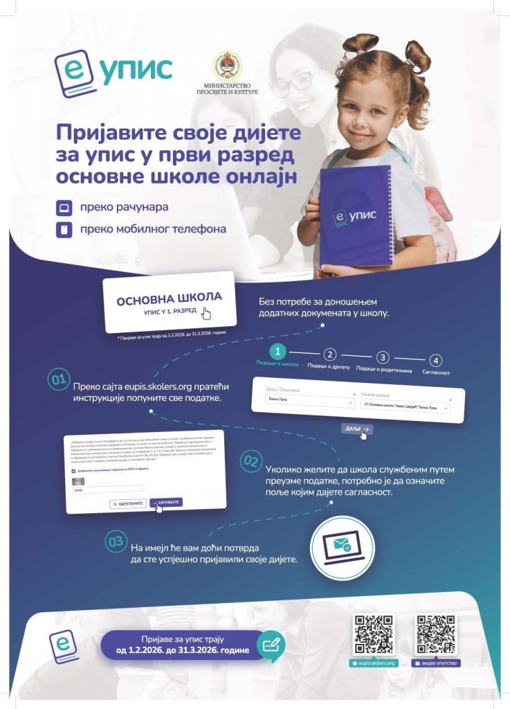 Од 1.2. до 31.3.2026. године свим родитељима дјеце дорасле за упис у први разред основне школе ће бити доступна могућност електронске пријаве за упис.
