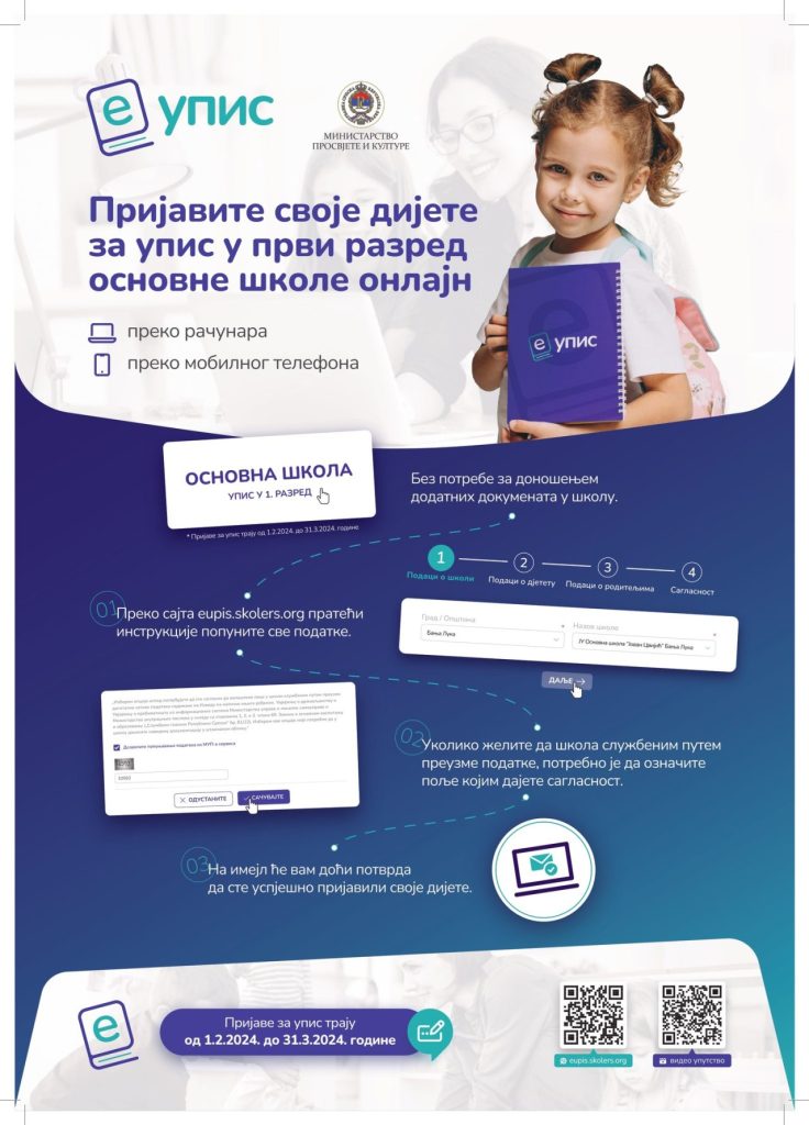 Министарство просвјете и културе Републике Српске омогућило je од 1. фебруара 2025. године електронску пријаву дјеце за упис у први разред основне школе за наредну школску годину путем еУпис платформе, која доприноси једноставнијем и бржем процесу уписа ученика у школу.