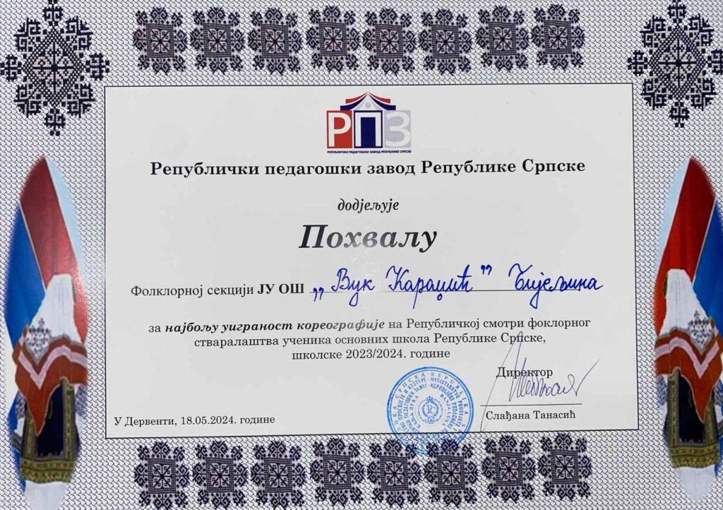 Награда за најбољу уиграност кореографије нашој феноманалној фолклорној секцији на Републичкој смотри фолклорног стваралаштва.
